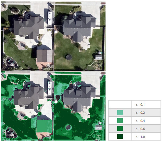As in Figure 4, selecting a threshold value changes the result of the irrigated area even for a single property. Because of the range of vegetative wellness, it is difficult to determine which areas within the property are being irrigated. If we continue to lower the threshold, we can include the entire landscaped area; however, this will not give us an accurate estimate of irrigated area for the parcel. An added complication comes when determining a single threshold value for an image containing hundreds of parcels. One could choose threshold values for each property, but this requires significantly more effort and defeats the purpose of the automated approach. Because the drone images were taken at different times of day and have different sun angles that affect surface reflectance, we chose threshold values for individual sets of images.