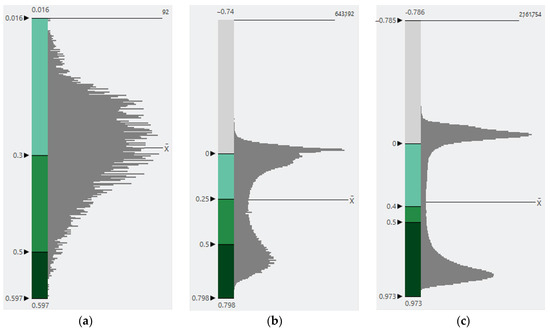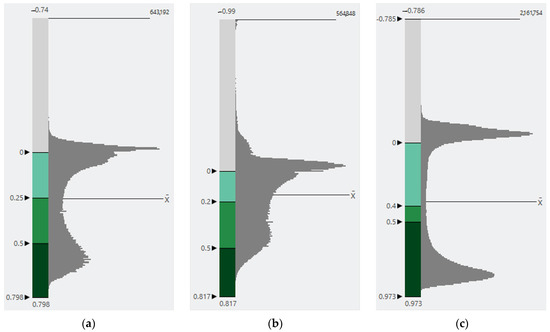 (a) NDVI value vs. pixel count distribution of Landsat (30 m resolution), (b) NDVI value vs. pixel count distribution for NAIP (0.6 m resolution), (c) NDVI value vs. pixel count distribution of drone images (0.067 m resolution).