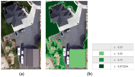 Some roofs and other materials have an NDVI value similar to vegetation. This means that we could not use NDVI to exclude these areas. The “Detect Objects Using Deep Learning” tool in ArcGIS Pro uses a third-party deep learning Python API to process a raster image [30]. Once the tool has completed its run, it returns a feature layer with polygons representing the classified image using different classification schemes.