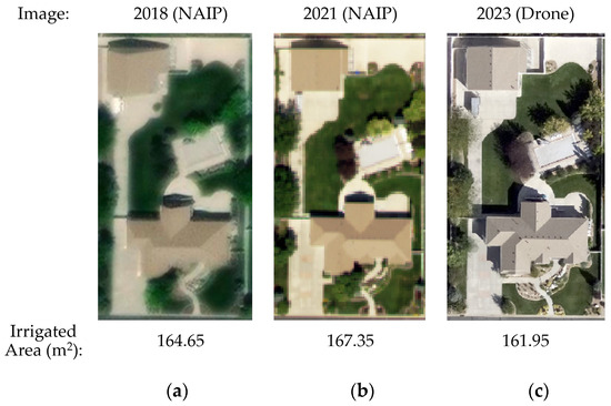 We did not find a meaningful variation in calculated irrigated area based on imagery type (NAIP vs. drone). We show this by comparing the irrigated area for a single parcel during the three time periods, which used NAIP and drone images. Figure 10 shows the change in irrigated area for the same parcel over the three time periods. This parcel was chosen because of the landscape design and plant health looked similar during three time periods. The 2018 and 2021 images are sourced from NAIP while that from 2023 comes from drone imagery. We find that the irrigated area is similar during all three time periods