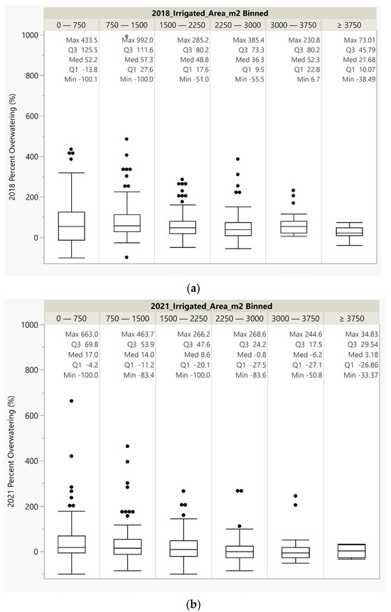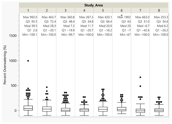 Figure 12 shows that for the eight study areas, the median amount by which users are overwatering ranges from 39.5% to −6.7%. Only two areas, Area 1 and Area 2, have median overwatering rates greater than 20%, two have median values of 20%, and the remaining four have overwatering rates between 11.7% and −6.7%. We did not perform an uncertainty analysis, but we expect that 10% to 20% is well within the range of error. All but one area, Area 1, has 25% of the parcels underwatered and Area 1 only has an overwatering rate of 2.6%. The box-and-whisker plots show that the data from all the areas are left skewed with several outliers (black dots) larger than 1.5 times the interquartile range.