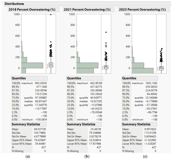 (a) Changes in percentage of overwatering during 2018, (b) Changes in percentage of overwatering during 2021, (c) Changes in percentage of overwatering during 2023.