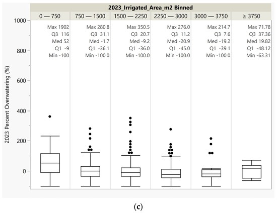 The over- or underwatering results are specific to our case study in Weber County, Utah, but the image analysis techniques are generally applicable. We found that the AIRS process produces valuable findings for water utilities. AIRS could allow the utility to see if their water conservation initiatives impact users’ irrigation efficiency. Much of the data we used—NAIP images, OpenET, local ET data—are publicly accessible and the AIRS approach can be implemented without coding experience. To exclusively use OpenET in the AIRS process, research is needed to determine if there is a calculation that could be performed on OpenET data to allow it to represent urban areas. Using the AIRS process could assist in locating which areas are most susceptible to overwatering and focus conservation efforts accordingly. Previous studies have shown that users with larger parcels or irrigated areas tended to water more efficiently [4]. Our findings support this conclusion (Figure 14). This finding supports the idea that water utilities should focus their water conservation efforts on those properties with small landscaped areas where overwatering is more common.