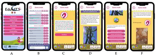 The ‘EduCITY at the UA campus’ AR game integrated into the EduCITY app ((A) Home menu; (B) Game selection menu; (C) Welcome message; (D) Question introduction; (E) Question and answer hypotheses; (F) Incorrect answer feedback).