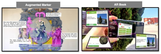 The EduCITY app offers two types of AR content: augmented markers and ARBook information (Figure 2) [].