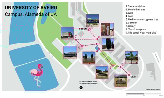 Figure 3 illustrates the route of the ‘EduCITY at the UA Campus’ game on the UA campus, with a particular focus on the UA Campus Boulevard (“Alameda”). The game starts next to the UA pedagogical complex, situated near a stone sculpture created by Isaque Pinheiro (1). It then proceeds through the “Alameda” of UA which comprises the maidenhair tree (2), the well (3), the lake (4), the Mediterranean cypress tree (5), and the canteen (6), until it reaches the library (7). The game concludes with a visit to the “Sapo” sculpture by Paulo Neves (8) and a visit to the tile panel “Voar mais alto” by Zé Penicheiro (9).