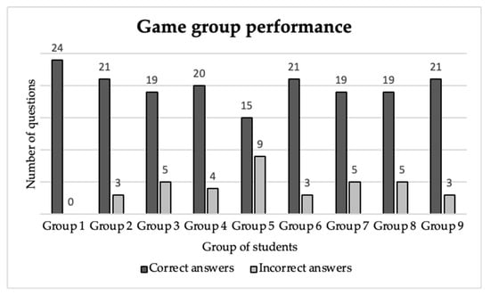 Group 1 demonstrated the highest level of accuracy, with 24 correct responses and no incorrect answers. In contrast, the group with the lowest score was Group 5, which achieved fifteen correct answers and nine incorrect answers. Groups 2, 6, and 9 did not correctly answer three questions (Figure 5). Group 4 did not correctly answer four questions. It can be observed that Groups 3, 7, and 8 answered five questions incorrectly.