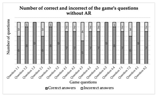 Number of correct and incorrect answers in the game without AR content.