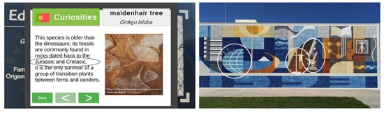 Figure 7 demonstrates that the two questions with AR that were answered correctly by all students were questions 2.2 and 9.3. In question 2.2, students were required to explore the maidenhair tree ARBook and select the “curiosities” button to find the answer. The geological period of fossils is new content for the students as it is not included in the biology and geology or science curricula. Despite the new content of this question, all groups got it right, showing that AR, and the ARBook in particular, helped them to answer the question. In question 9.3, students were asked to observe the tile panel and identify in augmented marker the elements of biology, chemistry and geosciences (Figure 8). The fact that all groups answered this question correctly demonstrates that the students had correctly used the full functionality of the augmented marker. This was evidenced by their successful exploration of the marker and their ability to locate the requisite information to answer the question correctly. As Floricel [] asserts, the incorporation of augmented reality features facilitates the illustration of the consequences of sustainability-oriented practices in comparison to existing practices. This approach encourages a more sustained engagement of individuals and groups in observing and immersing themselves in nature, comparing observations, and implementing and testing the effects of interventions.