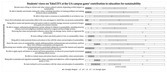 The aim of this study is to analyse the potential of the ‘EduCITY at the University of Aveiro [UA] Campus’ mobile AR game in terms of its capacity to promote education for sustainability among secondary students. To achieve this primary objective, students who participated in the activity were requested to complete a questionnaire survey at the conclusion of the activity. This was done in order to ascertain their views on the contribution of the EduCITY to the fields of education for sustainability []. Additionally, the automatically logged data from the EduCITY platform were triangulated with the survey results. This was done to ensure the validation of the results.
