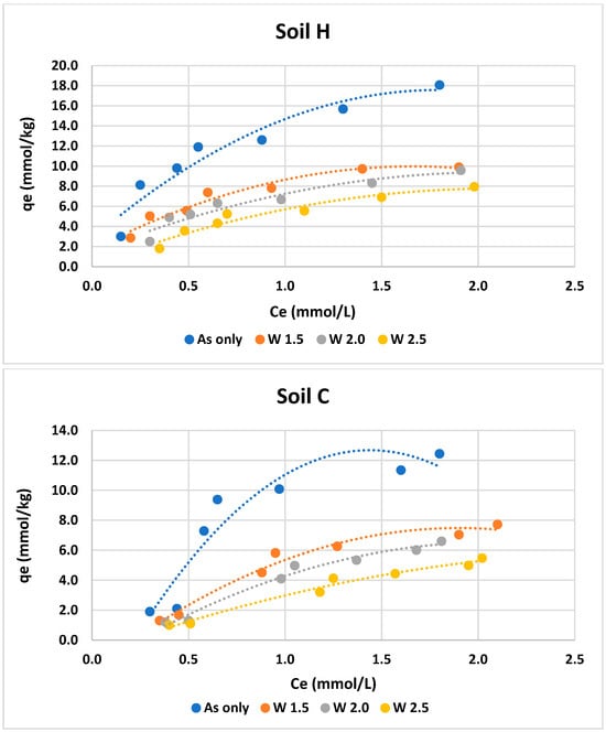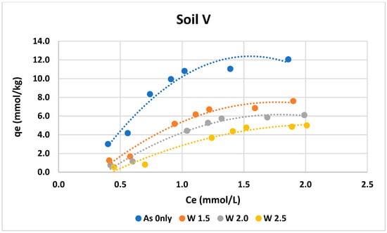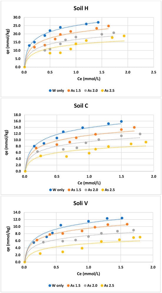 In the studied soils, the effect of the competing anion on arsenate qmax showed a decrease ranging from 53.7% (W 1.5 mM) to 61.8% (W 2.5 mM) for soil H, 31.0% (W 1.5 mM) to 52.5% (W 2.5 mM) for soil C, and 19.9% (W 1.5 mM) to 56.4% (W 2.5 mM) for soil V.