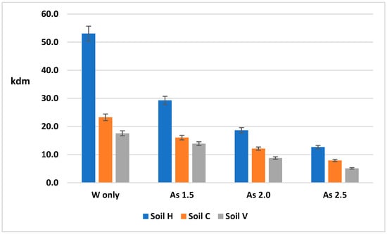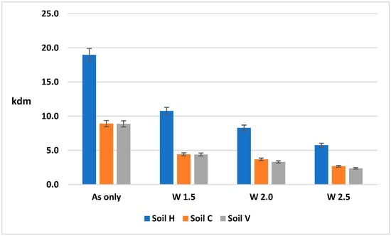 Our results indicate that the highest Kdm value was observed in the acidic soil (H), while the lowest was found in the most alkaline soil (V). In all soil types, the Kdm values decreased as the concentration of the competing arsenate anion increased from 1.5 to 2.5 mmol.