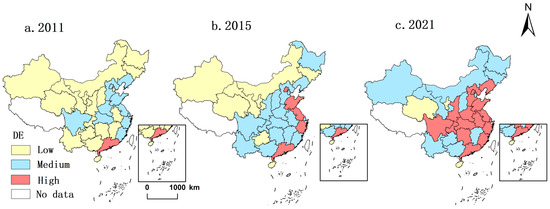 According to Figure 1a,b, the level of DE in most Chinese provinces remained low from 2011 to 2015. However, the number of low value DEs decreased, with the majority of distribution occurring in northwest China. Meanwhile, the number of medium and high-value DE areas increased, shifting from scattered distribution in the southeast coastal areas to concentrated distribution in southeast China. This was largely due to China being in the midst of its 12th Five-Year Plan, with a focus on upgrading technology industries related to the DE, increasing industrial integration and developing opportunities, thereby transforming China’s information industry from large to strong, and developing the DE across all provinces in China. The eastern region of China, especially the southeast coastal region, relies on its superior geographical conditions to enable its DE to develop rapidly, thus differentiating itself from other regions.