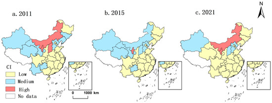 Combined with Figure 2a,b, it can be seen that from 2011 to 2015, the number of regions in China with high CI has decreased. However, the CI of certain provinces has decreased, with most low-value CI regions located in the southeast. This can be primarily attributed to China’s implementation of a comprehensive carbon emission control system during the “12th Five-Year Plan” period. Energy conservation and emission reduction have been emphasized as crucial focal points to optimize the economic structure, promote green, circular, and low-carbon development, and expedite the construction of an ecological civilization. Various provinces also actively and orderly promoted carbon emission reduction. As the leading region of China’s economy, the CI in the southeast is lower than that in the northwest.