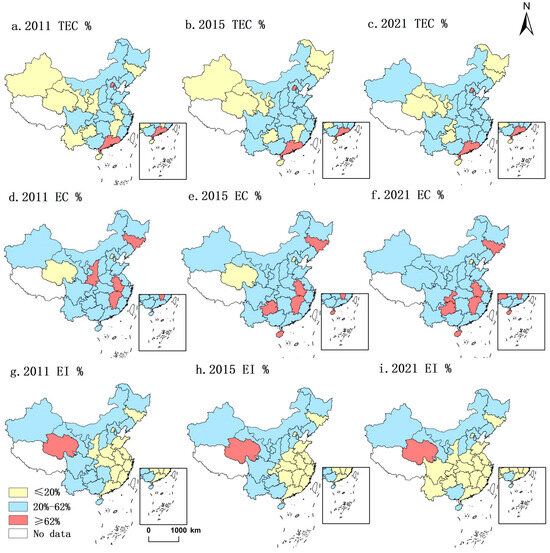 Combining the data and Figure 3, we can see that from 2011 to 2021, the overall trend in TEC in China is rising, with TEC-intensive regions becoming increasingly concentrated and showing a trend in spreading from the southeast to the northwest. Compared to TEC, EC in Chinese provinces is generally higher and trending upwards, with over 62% of the provinces mainly concentrated in the southeast, and the number of provinces has increased from 4 in 2011 to 6 in 2021. On the other hand, EI in Chinese provinces is generally showing a downward trend, with less than 20% of the provinces mainly concentrated in the southeast. Although China has been implementing energy-saving and emission reduction policies during the “Twelfth Five-Year Plan” and “Thirteenth Five-Year Plan”, it is still mainly reliant on coal consumption, indicating a continuing strong demand for energy consumption.