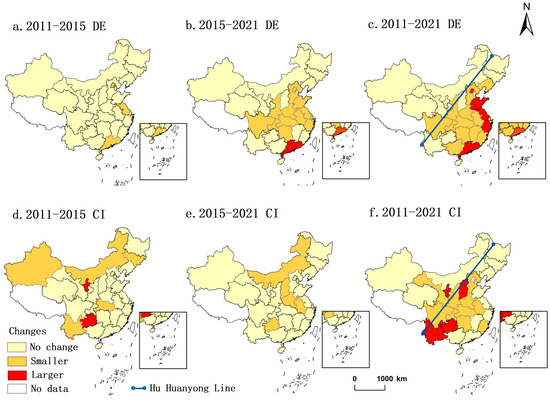 Firstly, from 2011 to 2021, the spatio-temporal heterogeneity and opposing trends in China’s DE and CI were evident. The DE showed a low overall trend in the northwest and a high trend in the southeast, while CI exhibited a high trend in the northwest and a low trend in the southeast. The distribution of change areas for both indicators closely followed the Hu Huanyong Line, with significant changes concentrated in the southeast of China, particularly in the coastal areas.