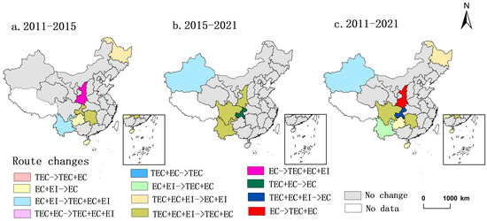 According to Figure 6a, from 2011 to 2015, the paths of most provinces did not change, and the other provinces that did change had more types of path changes and were scattered in the eastern region in space. Among them, many provinces changed from multi-path to TEC and EC dual path. According to Figure 6b, from 2015 to 2021, the number of provinces with no path change has slightly increased, while the remaining provinces that experienced changes in their paths showed a more concentrated and consistent type of path change, and they are relatively clustered in the western region in terms of spatial distribution. Among them, many provinces changed from multi-path to TEC and EC dual path. Based on Figure 6c, overall, from 2011 to 2021, the paths of the vast majority of provinces have not changed, while the types of path changes in the remaining provinces are diverse, and spatially concentrated in the western region. Among them, there are still many provinces with multiple paths that have changed to dual paths of TEC and EC, and these changes are also concentrated.