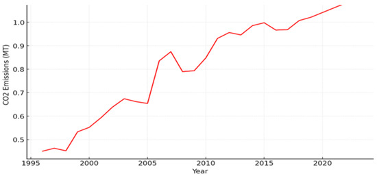 Figure 1 shows the trend of CO2 emissions from 1996 to 2023. It highlights a steady increase in CO2 emissions over the years, with some fluctuations in the early 2000s and a sharper rise starting around 2008.