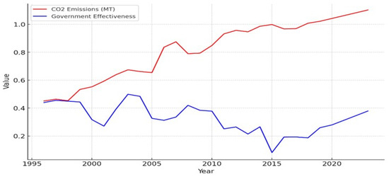 Figure 4 shows the relationship between CO2 emissions and government effectiveness from 1996 to 2023. The red line represents CO2 emissions, while the blue line represents government effectiveness. The graph illustrates fluctuations in government effectiveness over the years while CO2 emissions have steadily increased.