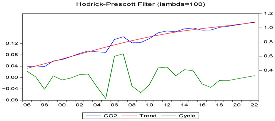 This analysis reveals that both energy consumption per capita and real GDP per capita are positively linked to CO2 emissions, which aligns with the environmental Kuznets curve (EKC) hypothesis. This theory suggests that environmental degradation increases during the early stages of economic growth but begins to decline once a certain income level is reached, as more resources are dedicated to environmental protection and the adoption of cleaner technologies [45,46]. Such a pattern has been observed in various developing economies, especially those experiencing rapid industrialization and urbanization, similar to Oman [37] The significant association between energy consumption, GDP, and CO2 emissions highlighted in this study underscores the urgent need for Oman to adopt cleaner energy technologies and enhance energy efficiency to reduce the environmental impact of its economic growth.