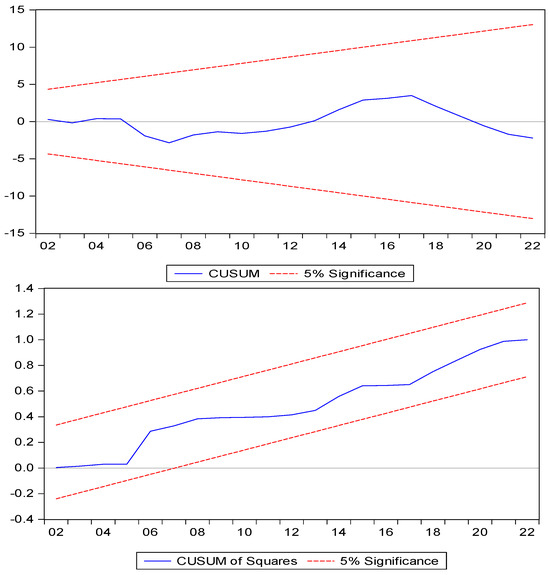 Furthermore, to verify model stability, this study employed the CUSUM and CUSUMSQ tests. These tests assess the stability of the model, and the corresponding charts at a 5% significance level are illustrated in Figure 6. In the charts, the residuals are outlined in blue, while the confidence intervals are represented by red lines. At the 5% significance level, it is evident that the residuals of the variables consistently remain within the confidence intervals, indicating that the model is stable.