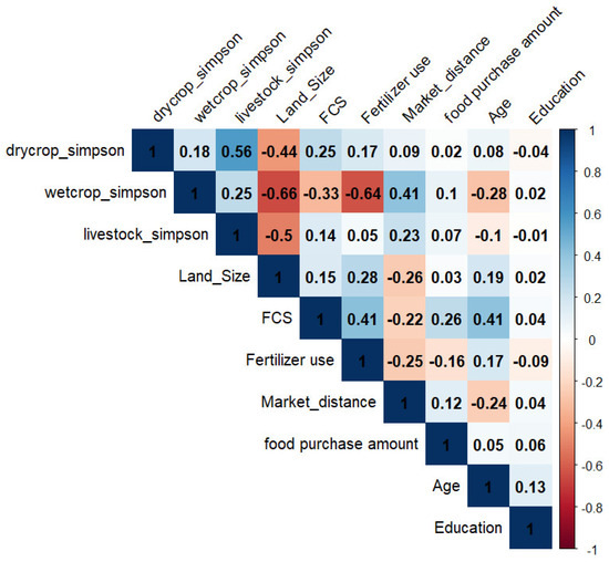 The correlation matrix heatmap visualizes the associative magnitudes among variables pertinent to socio-economic status and agricultural diversity. In Figure 3, the coefficients within this matrix oscillate between −1 and 1, symbolizing a spectrum from negative to positive linear relationships, respectively. Notably, a pronounced positive linear relationship is observed between ‘drycrop_simpson’ and ‘wetcrop_simpson’, with a correlation coefficient of 0.56, suggesting a concurrent increase in both variables. Conversely, ‘wetcrop_simpson’ and ‘Land_Size’ exhibit a notable inverse relationship, with a correlation coefficient of −0.66. The heatmap employs gradations of blue to denote positive correlations and shades of red to denote negative correlations, with the depth of color intensity corresponding to the strength of the correlation.