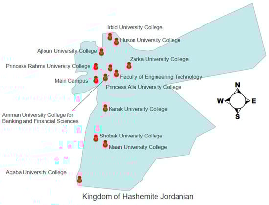 Figure 1. Al-Balqa Applied University—main campus and external colleges.