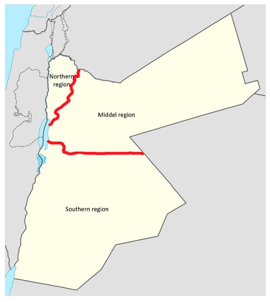Due to Jordan’s small and uncomplicated national grid [36], the country’s electrical distribution businesses are split up into three regions [37]. As shown in Figure 2, these regions consist of the North (Irbid Distribution Electrical Company (IDECO)), Middle (Jordan Electric Power Company (JEPCO)), and South (Electricity Distribution Company (EDCO)) [36,38]. Yet, most of the electrical power is consumed by the middle region which contains the capital of Jordan (Amman) and covers the largest industrial plants in Jordan. Meanwhile, with transmission lines of 400 KV and 132 KV covering the entire country, the government of Jordan takes full responsibility for operation, security, and maintaining efficiency through the National Electric Power Company (NEPCO). On the other hand, BAU has a unique characteristic of scattered colleges around the country; BAU has faculties on the three distribution networks and pays electrical bills based on the faculty location region requirements. Therefore, since BAU is the only university in Jordan with so many widely distributed campuses, this work intends to generalize the proposed design to a widely affected area.
