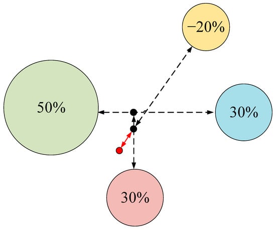 In RWG, the PV generation of the total demands of BAU is produced in a single location. The optimum location of PV is calculated using the centroid of mass theory. The method of centroid two demands is between two demands, where the weight (W) of both demands is affected. On the other hand, the PV generation location effect negatively affects the final centroid location. Figure 3 presents three demands, and single generations are located separately. The centroid of two points, 50% and 30% of demands, is located in the same line between two points closer to two high demands.