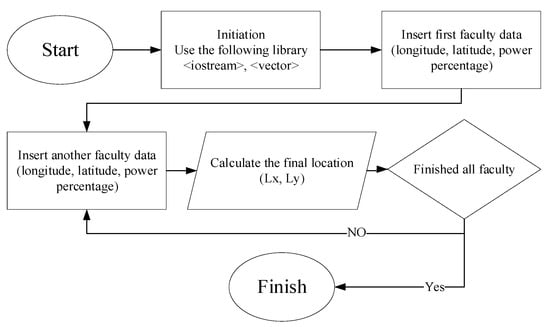 where Lx and Ly are the x-axes and y-axes of the final location of the centroid of mass theory, Wn is the demand percentage based on the total demands, and Ln,x and Ln,y are the x-axes and y-axes’ nth demands. It is worth mentioning that the x-axes and y-axes are the longitude and latitude of each faculty. Based on this, the multi-location of BAU faculties is used in Table 1 with its power percentage, and the program’s flowchart is presented in Figure 4. The final results of Table 1 data used in the Figure 4 methods are 31.9644° latitude and 35.8072° longitude, where 12 MW PV power is required.