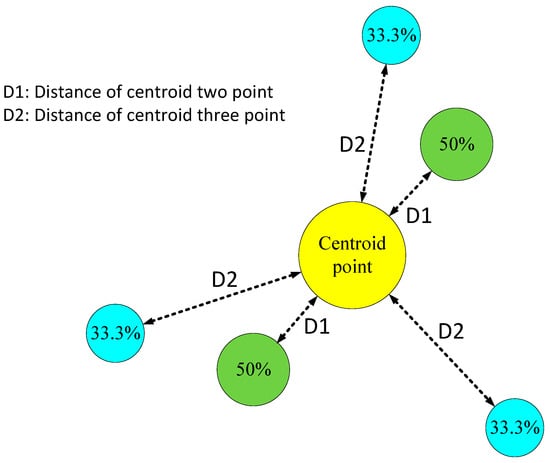 After the centroid of a single point is located and weighted as presented previously, the centroid design using two points or more can be determined. The methodology of two points and more is focused on a single point (centroid), whereas in centroid mass theory, the center point provides an equilibrium weight result. Figure 5 illustrates centroid power generation, showing two-point and three-point configurations, providing half and one-third power, respectively. These points are positioned opposite one another, corresponding to the location and magnitude of a single centroid’s demand.
