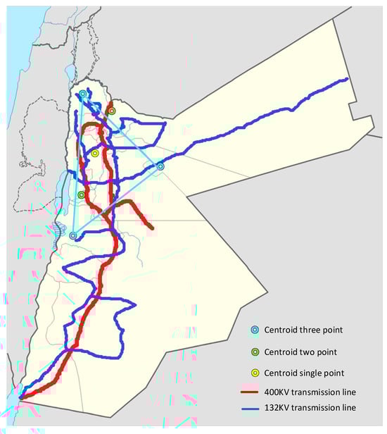 Figure 6. The transmission lines of 400 KV and 132 KV in Jordan are also the single-, two-, and three-centroid points of the proposed RWG PV design [38].