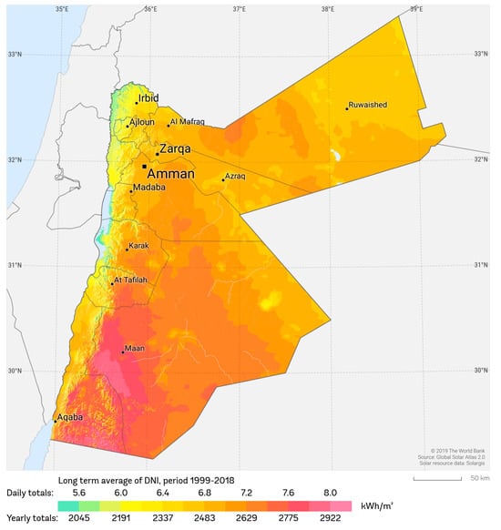 In general, Jordan has a higher irradiation value than other countries with moderate temperature values. Thus, PV solar cells are one of Jordan’s most common renewable energy resources [20]. Based on this, it is efficient to install PV farms in the southern part of Jordan, with high irradiation records, for all BAU facilities, as presented in Figure 7.
