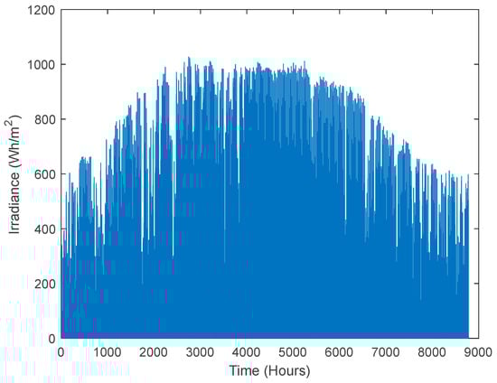 In 2023, as shown in Figure 8, the annual sun irradiation data in Jordan, registered by the NASA Surface Meteorology and Solar Energy database, showed a high and recommended recorded irradiation of 1000 Wh/m2 for the summertime. In winter, an acceptable irradiation value was recorded, reaching 600 Wh/m2 [41].