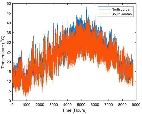 Figure 9. Annual temperature in north and south Jordan per hour in 2023.