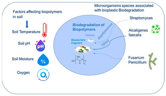 Some biodegradable plastic polymers are marketed as potential alternatives that are degraded in soil after use without requiring additional removal and disposal [72,73]. For example, PBAT + PLA, PHA, and starch–PE blend showed less than 90% reduction in soil for 5 years [47]. The degradation rates of PLA and PHA were 70% and 20%, respectively, in 10 cm of soil for 3 years [34]. Starch plastics showed a weight loss of only 3.2% in an agricultural field from Japan for 48 weeks [52]. These results indicate that biodegradable plastics require up to 5 years or more to achieve nearly complete degradation in the soil. The biodegradability of biodegradable plastics in soil depends not only on their chemical properties but also on environmental factors such as oxygen content, pH, and microorganisms in the soil [74,75,76], as shown in Figure 2. Bioplastics degrade faster in soil than in water and air environments [77]. The possible reason is that a wide range of microorganisms in the soil have a significant effect on the degradation of plastics, among which Aspergillus spp. and Penicillium spp. are promising strains for biodegradation of plastics [78,79,80].
