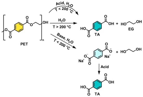 Hydrolysis of PET under acidic, neutral, or basic conditions. Reproduced with permission from ref. [134].