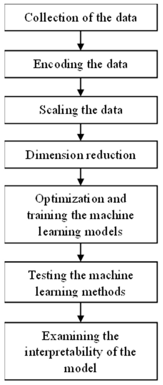 SVM is a vector-based machine learning method that is based on structural risk minimization principle via statistical leaning theory [36]. In this method, a hyperplane, which indicates a line dividing a class of data points, is identified. However, a perfect hyperplane cannot be attained in non-linear problems. In other words, the error is allowed in the learning process, and the hyperplane with the lowest error is obtained. At the end, the hyperplane with the maximum margin and minimum error is obtained, namely optimum hyperplane [37]. In many real-life problems with non-linear datasets, a linear hyperplane cannot be formed, and kernel functions are usually used for enhancing the model’s accuracy [38]. There are several kernels, such as radial basis function, sigmoid function, and polynomial function. Since the selected kernel significantly impacts the performance of the model, the kernel is also considered as one of the parameters to be tuned in the parameter tuning process. As for the SVC hyperparameters, the kernel function, gamma, and the C parameter were optimized. The kernel function is the mathematical function used by SVC to find the classification boundaries in the data. Additionally, the gamma parameter determines the influence of the kernel function on the model. The C parameter is related to classification errors. A high C value increases model accuracy, while a low value decreases it.