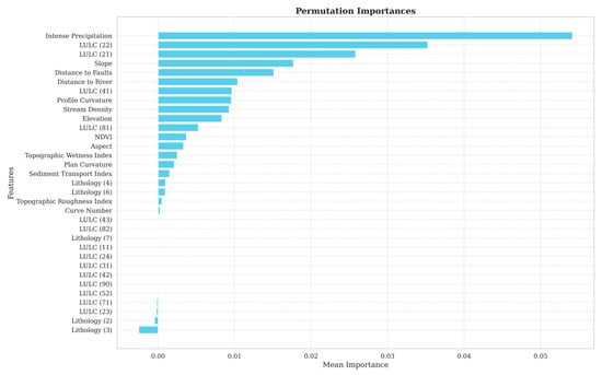 In this study, a total of 16 different landslide conditioning factors were considered. Given the employed one-hot encoding scheme for categorical variables (i.e., lithology and land use/land cover), the total number of inputs taken into account in the predictions was 33, which limits the computational efficiency of the machine learning applications. Hence, the present research employed permutation importance to identify the key independent variables, primarily contributing to the prediction of landslide-prone regions. Due to the widespread usage of integrated PI and random forest (RF), this study incorporated the traditional tree-based RF algorithm into the PI determinations. The results obtained through this integrated framework are presented in Figure 4. It can be seen in the figure that, with the highest mean importance value, intense precipitation (also known as heavy rainfall) has the most significant impact on the landslide susceptibility predictions. In addition, one can observe in Figure 4 that the probability of intense precipitation is followed by two distinct LU/LC classes, i.e., LU/LC (22) and LU/LC (21), which reflect the presence (or non-existence) of developed–low-intensity and developed–open-space areas, respectively (https://www.mrlc.gov/data/legends/national-land-cover-database-class-legend-and-description, accessed on 14 September 2024). Also, slope yielded one of the highest mean importance values, illustrating the augmented impact of slope on determining landslide-prone regions. At fifth and sixth places, the distance to faults and distance to river criteria are ranked, respectively, with mean importance values between 0.01 and 0.02. Similarly, LU/LC (41) and LU/LC (81) showed significant potential to have an impact on the estimation of landslide-prone areas, which represent deciduous forest areas dominated by trees generally greater than 5 m tall, and greater than 20% of total vegetation cover and pasture/hay areas of grasses, legumes, or grass–legume mixtures planted for livestock grazing or the production of seed or hay crops, typically on a perennial cycle, respectively. It is worth noting that the threshold aiding to eliminate the conditioning factors posing limited contribution to the predictions was set to 0. Therefore, most of the sub-classes of both lithology and LU/LC were excluded from the decision framework. Consequently, the number of predictors was reduced to 20, helping sustain the computational efficiency of the established hybrid predictive models. Hence, the following predictions were carried out concerning the predictors with mean importance values greater than 0.