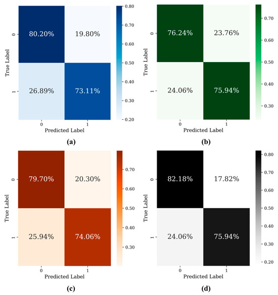 Confusion matrices of the hybrid ML algorithms based on the testing set: (a) ABC-ANN, (b) ABC-KNN, (c) ABC-SVM, and (d) ABC-SGB.