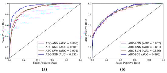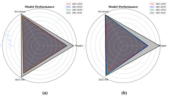 Table 4 further shows the Kappa and area under the precision–recall curve (AUC-PR) values. Accordingly, the most powerful method for the testing set regarding the Kappa statistics was again the ABC-SGB model (Kappa: 0.7802), followed by the ABC-SVM (Kappa: 0.5367), ABC-ANN (Kappa: 0.5320), and ABC-KNN (Kappa: 0.5216) models. Similar conclusions can also be drawn for the AUC-PR metric, such that the ABC-SGB model was the most powerful hybrid model, followed by the ABC-SVM, ABC-KNN, and ABC-ANN model, with AUC-PR values of 0.7438, 0.7200, 0.7082, and 0.6251, respectively.