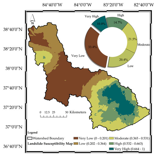 According to the results obtained with respect to the testing set using the ABC-SGB hybrid model, a landslide susceptibility map is generated for the Kentucky River basin (Figure 8). To divide the susceptibility level to landslide events, Jenks natural break, which is one of the most commonly used optimization-based clustering methods, was used. Using this technique, the catchment was divided into five distinct classes, namely very low, low, moderate, high, and very high. The likelihood of experiencing landslide events in regions falling into the very low cluster was calculated to be 0.201 at most (out of 1), while a low likelihood is represented by a probability between 0.202 and 0.364. Regions having moderate potential to be subjected to landslide events have a probability between 0.365 and 0.531. Consequently, high and very high clusters refer to the likelihood of landslide events between 0.532 and 0.663 and between 0.664 and 1, respectively. Furthermore, area percentages with regard to each susceptibility cluster were computed for the region of interest. Associatively, as depicted in Figure 8, 33.4% of the interested area posed very low susceptibility, and domains located at mid-part and in the vicinity of the downstream showed very low susceptibility. Similarly, regions that have a low likelihood of being subjected to landslide incidents are positioned in a mid-part (a relatively smaller area compared to the very low cluster) and close to the downstream (a larger area compared to its counterparts) and cover 20.4% of the entire catchment. Moderate susceptibility is observed in 21.5% of the Kentucky River basin in which the corresponding regions are located in the regions with a relatively closer distance to the upstream and the northwest of the basin. In addition, areas with high and very high susceptibility to landslide incidents are positioned in the southern part of the basin, generally corresponding to higher elevations characterizing slopy properties (Figure 3e,m). These areas cover 14.7% and 10.0% of the basin, respectively. Along with the impact of elevation and slope, the potential to receive intense precipitation has a significant impact on the obtained findings as it is the most influential criterion according to the permutation importance. Accordingly, the corresponding regions (as illustrated in Figure 3f) corroborate the areas posing high and very high susceptibility to landslides.