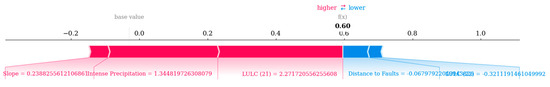 In this research, to increase the interpretability of the obtained findings, the SHAP algorithm was incorporated into the hybrid model, which enabled the highest predictive success [45], as recommended by researchers [42]. Hence, the ABC-SGB model was used to identify the contribution of the conditioning factors to the landslide events’ predictions. Also, the five most contributing attributes are presented through a SHAP force plot in Figure 9. The SHAP force plot addresses the bold value (i.e., 0.60), which highlights the model’s score for an observation. Higher scores and lower scores lead the machine learning models to predict 1 and 0 in a binary classification problem. Additionally, the red bars increase the score, while the blue bars decrease the score. Hence, the figure illustrates that the area focused on in Figure 9 is predicted as a landslide point due to its high slope, intense precipitation, and land cover type of LULC (21). The findings are in line with the existing literature as researchers highlighted the role of intense precipitation and high slope as contributing conditions of landsliding [46].
