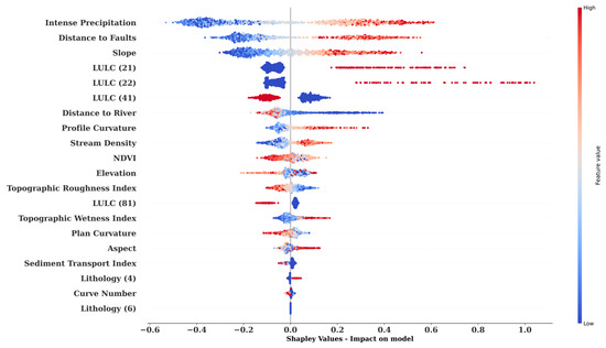 The SHAP summary plot results are also presented in Figure 10 in which the attributes placed on the y-axis on the left-hand side of the figure are ordered from top to bottom based on their importance levels. The dark red points on the figure show that the actual values of the corresponding predictors converge to their higher values, while the dark blue points show the opposite. In addition, the points positioned on the right-hand side of the SHAP summary plot illustrate that the region tends to experience landslide incidents (coded as 1), whereas the points on the left-hand side indicate that these instances contribute to the decreasing trend in the likelihood of being subjected to landslide hazards. In this sense, the potential to receive intense precipitation events is highly influential in experiencing landslide events as this attribute is positioned at top, and the higher the probability of experiencing heavy meteorological incident in regions, the higher the likelihood of the occurrence of landslide events. This outcome can be supported with the generated layer in Figure 3f, which demonstrates the conglomeration of past landslide points on the regions that previously received intense precipitation (dark blue areas). Also, Camera et al. [46] recognized the significance of the inclusion of intense rainfall in landslide susceptibility mapping studies and found that an increase in rainfall values above a certain threshold results in an increase in the susceptibility of regions to landslide incidents. Likewise, Araújo et al. [47] considered that extreme rainfall events are of critical importance in terms of assessing the physical processes for landslide triggering, highlighting the importance of including rainfall regimes’ in the identification of landslide susceptibility levels.