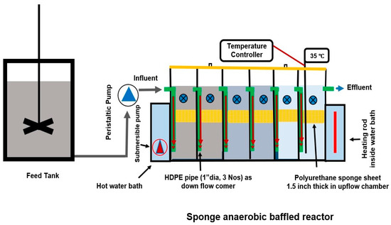 To avoid short-circuiting and improve treatment performance, each sponge sheet covered the whole cross-sectional area of the upflow chamber so that wastewater flowing through the ABR may completely come in contact with the sponge sheet in each chamber. Sponge sheets had more than 80% voidage to provide sufficient space for biomass retention and metabolism. The sponge sheets covered 13% of the reactor working volume. The reactor was properly sealed to make it airtight. A variable-speed peristaltic pump was used to supply synthetic wastewater from a feed tank with a 300 L storage capacity. Fresh synthetic wastewater was provided to the feed tank on every third day of operation. The pump regulated controlled flow into the reactor. A schematic diagram of the experimental setup is presented in Figure 1.