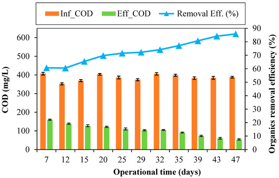 A comparative analysis of the reactor was conducted to evaluate the treatment performance of the reactor before and after the introduction of polyurethane sponge sheets. This assessment aimed to determine the improvements in treatment efficiency of the reactor that might be attributed to the incorporation of the sponge sheets. The performance of the reactor in terms of COD removal before and after the implementation of sponge sheets is presented in Figure 9.