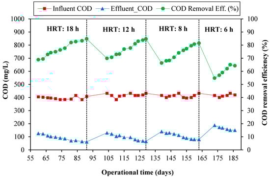 In wastewater treatment, removal of organics occurs through microbial degradation, where bacteria utilize biodegradable pollutants as an energy source to sustain diverse cellular functions [32,33]. To assess SABR organics removal performance and explore the shortest HRT to meet effluent organics discharge permissible limits, the reactor was operated at four different HRTs of 18, 12, 8, and 6 h. Organics removal behavior of the reactor in the performance evaluation phase is illustrated in Figure 3. The figure shows influent COD concentration, effluent COD concentration, and organics removal efficiency (ORE) of the reactor.