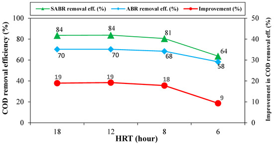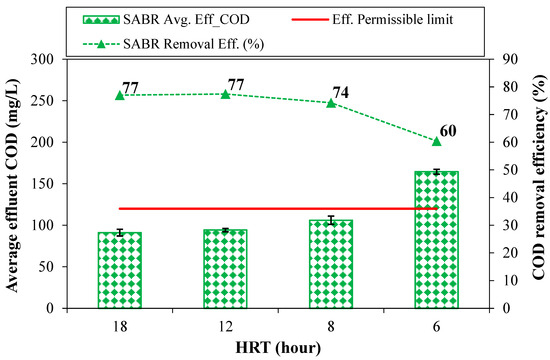 SABR average COD removal performance is presented in Figure 4. The figure shows SABR average effluent COD concentrations along with COD removal efficiencies at various HRTs and effluent COD permissible limit of 120 mg/L [35]. The SABR demonstrated an average ORE of 77% at HRT of 18 h and sustained this removal efficiency till HRT 12 h. Liu et al. (2022) [14] reported average COD removal efficiency of 76.7% at HRT of 12 h using a modified anaerobic baffled reactor. A slight reduction in performance of the reactor was observed when shortening HRT from 12 to 8 h as the ORE dropped to 74 and 67%. Nasr et al. (2009) [36] reported COD removal of 67.5% in treating domestic wastewater by an anaerobic baffled reactor followed by a duckweed pond under ambient temperature at this HRT. Further shortening HRT to 6 h caused a reduction in the average ORE of the SABR to 60%.
