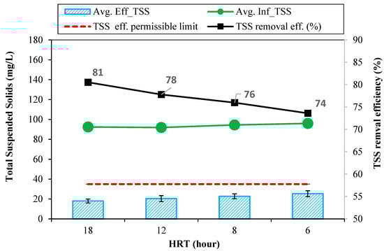 Average TSS removal performance at various HRTs and effluent TSS permissible limit.