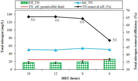 Total nitrogen removal at various HRTs and effluent TN discharge permissible limits.